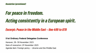 At their 51st Ordinary Federal Delegates Conference in Hanover, 28–30 November 2025, the German Greens have changed their position on the middle East moving it much closer to the majority view within the European Green Party (EGP). This has been widely noticed in the German media. Below is an English excerpt of the resolution addressing […]