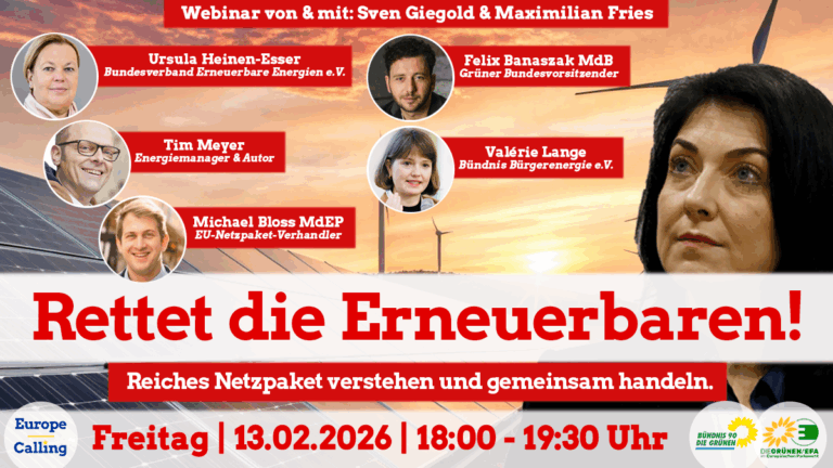 In diesem Webinar bringen wir Expert:innen, Verbände, Industrie und Politik zusammen, um zu verstehen, was genau in diesem “Netzpaket” steckt und welche Folgen es hätte. Außerdem werden wir vorstellen und mit Euch diskutieren, wie wir gemeinsam handeln können, um CDU, CSU und SPD von diesem Plan abzuhalten. Die Erneuerbaren brauchen mehr Tempo und geringere Kosten beim Ausbau. Dazu stellen unsere Gäste ihre eigenen Vorschläge vor.